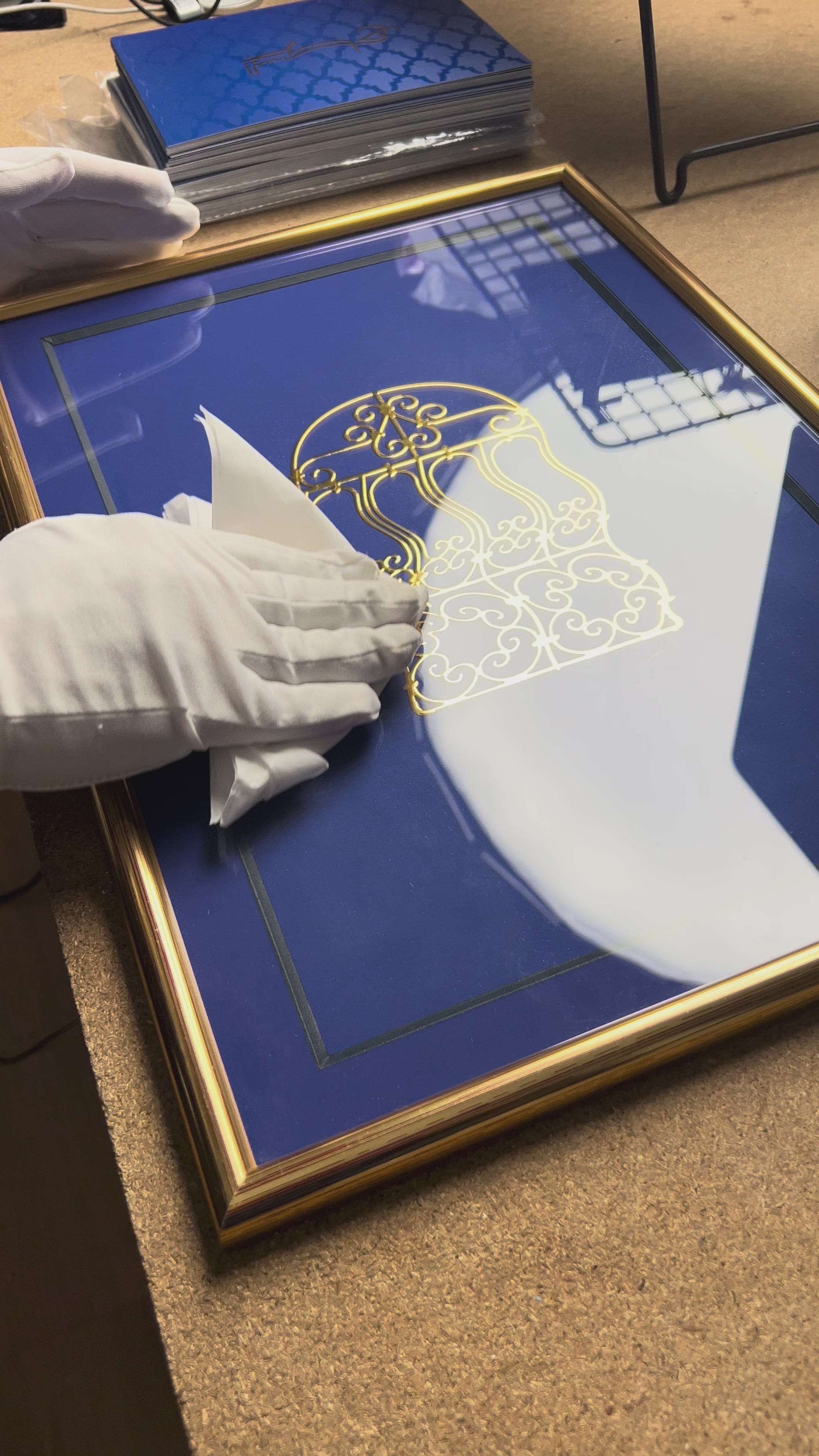 Printed on textured 270g paper with specialized gold techniques, it achieves a dimensional effect where light shifts across the surface, scattering subtle golden stars. Each edition is framed in handcrafted gold with deep blue matting, and comes with a signed certificate of authenticity.